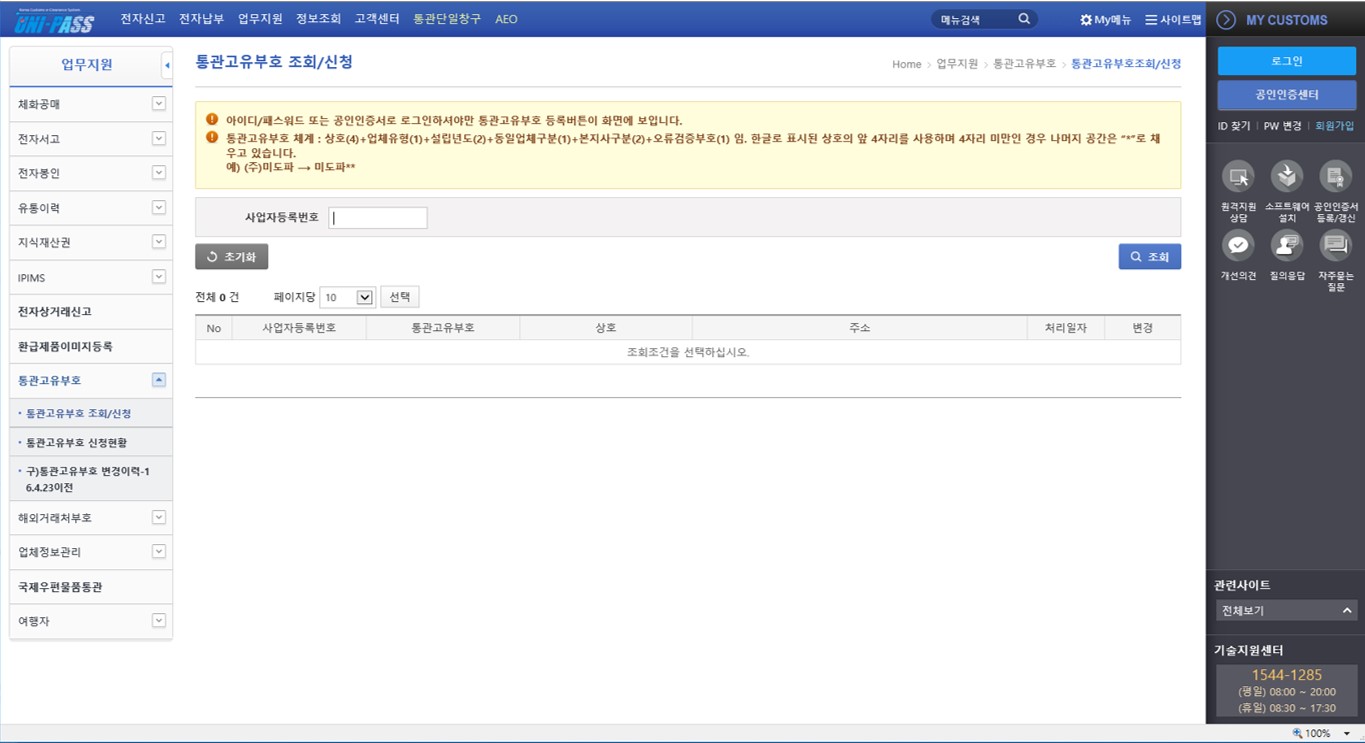 중간 부분에 통관고유부호 조회/신청 부분을 클릭하시면 사업자 조회 화면이 뜹니다.